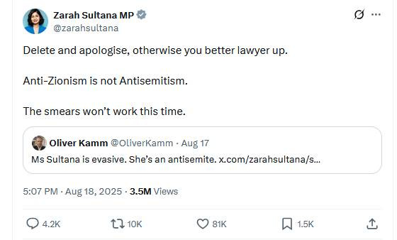 When the far-right Times journalist, Oliver Kamm, accused Zarah Sultana of ‘anti-Semitism’, a term that has been drained of all meaning, she stood up and declared that anti-Zionism was not anti-Semitism.